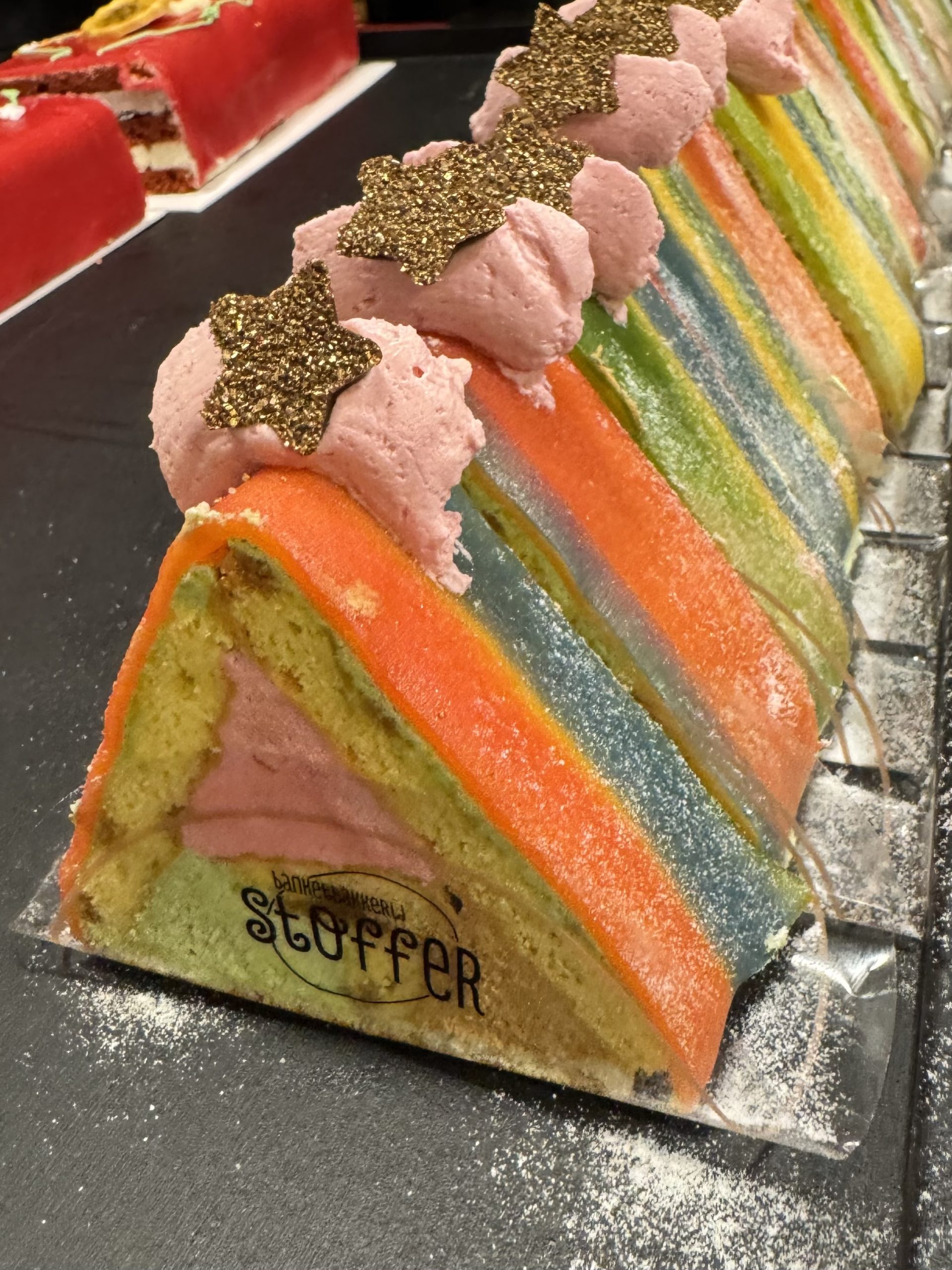 Moskovische cake zorgt dat de vulling van drie componenten niet direct met elkaar in contact komt; pistache crème, Irish Coffee crème en frambozencrème. Bekleed met abstract gekleurde marsepein.